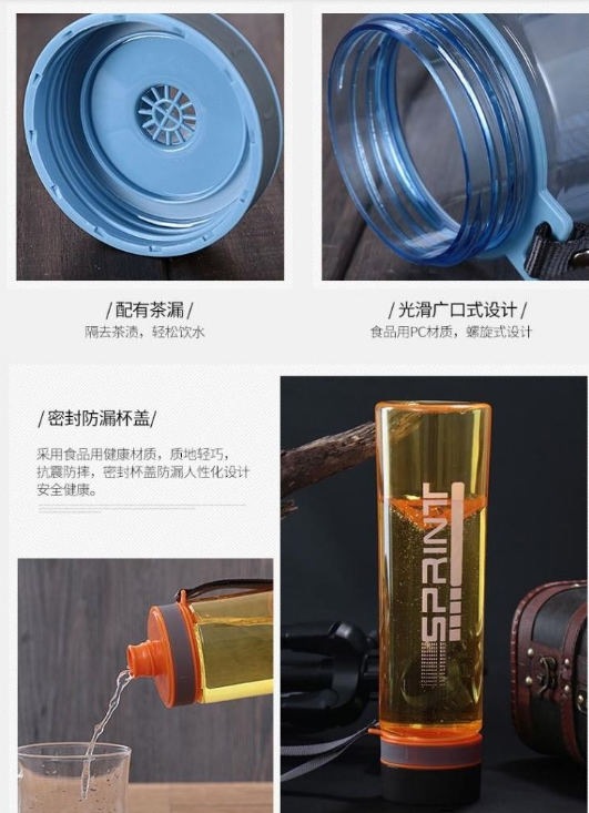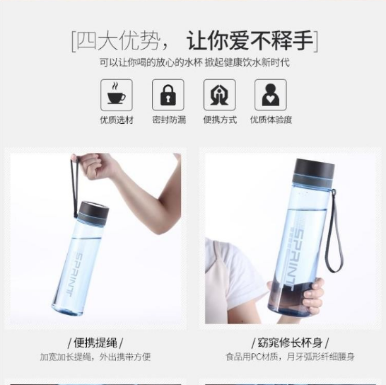 產(chǎn)品特點:食品用PC材質(zhì),月牙弧形纖細腰身,加寬加長提繩,外出攜帶方便,讓您喝的放心的水杯。